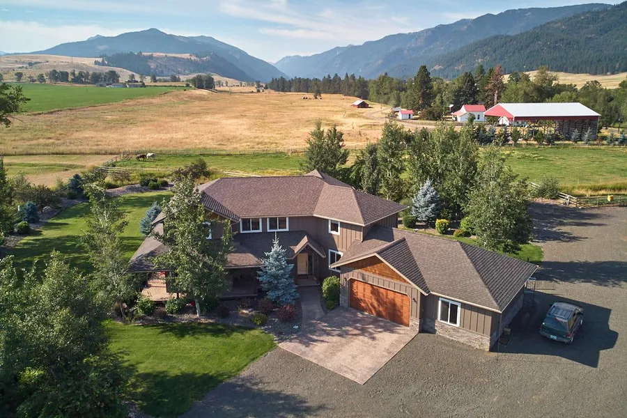 This home has a light and open floor plan with a vaulted ceiling and large windows. The living area has a propane fireplace and views of Lostine Canyon. There are both wood and tile floors in the living area and carpet in the bedrooms. The kitchen has stainless steel appliances and a breakfast bar. The master bedroom is also on the main level and has a cozy propane fireplace, en-suite bathroom and walk-in closet. The bathroom has both a soaking tub and walk-in shower. There is another full bathroom on this level for your guests. Upstairs, there is a second living space with a wet bar, propane fireplace, and views looking out both sides of the house. There are 3 more bedrooms and another bathroom. The home additionally has a full-size laundry room, an office, and an attached 2-car garage.