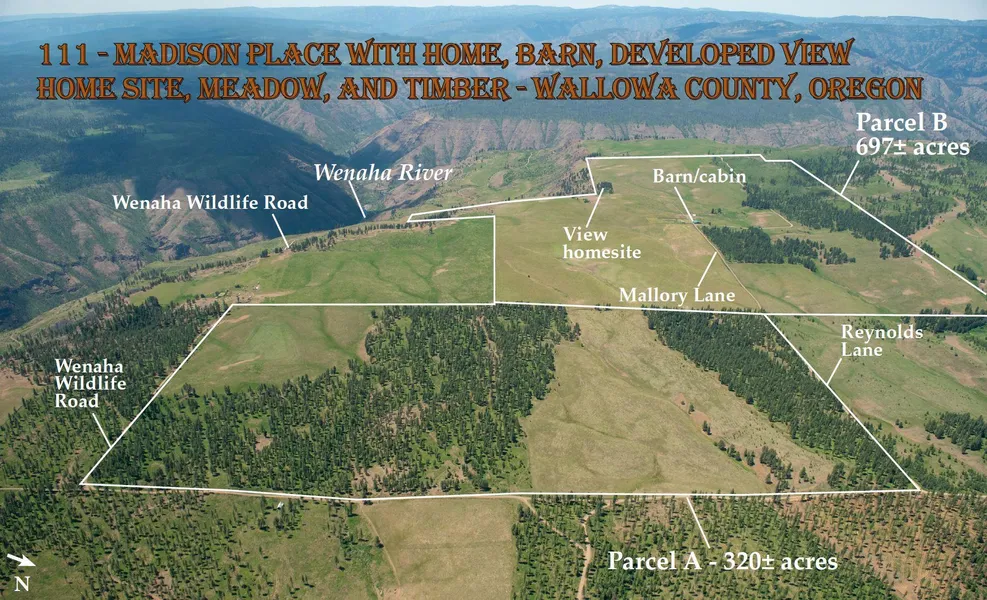 The 1,017 acre Madison Place Ranch property is being offered in its entirety, or in two parcels of 320 acres and 697 acres. It is located in the southwestern part of Grouse Flats and west of Auction Property #112, Bosley Place Ranch, at the southeast corner along Reynolds Lane. Washington State line is along its northern boundary. Prior to being purchased by Seller, the property was used as a horse operation. A view home site was developed by the former owner, on a ridge, providing views west to the Wenaha Wilderness.