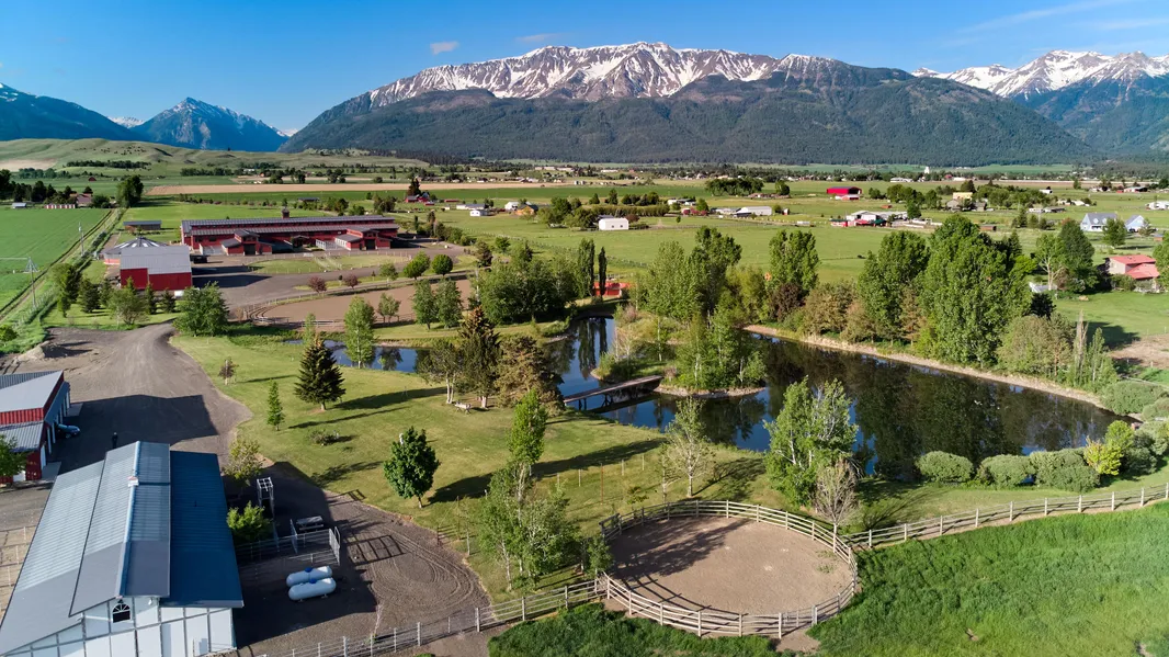 The land offers expansive pastures with mountain views and a 1.3 acre pond with a walking bridge and pier. The property also has irrigation rights, supporting lush greenery year-round.