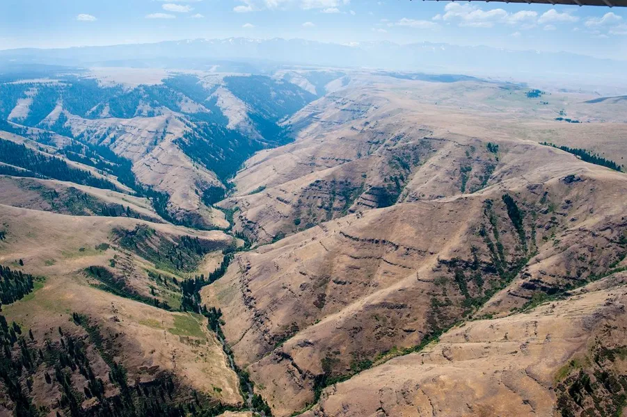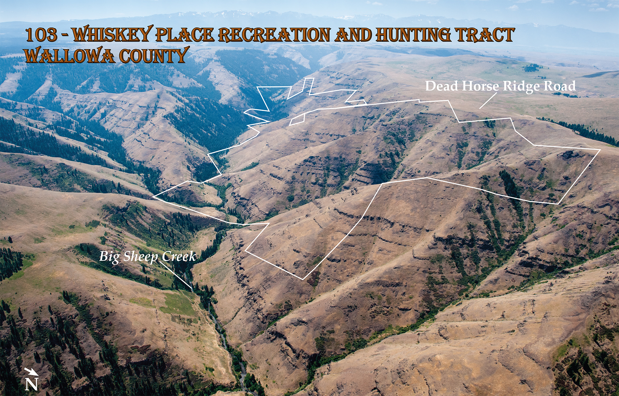 The 1,439 acre Whiskey Place Recreation and Hunting Tract is located one mile north of Marr Flat, along the southeast steep-facing slopes of Dead Horse Ridge, with over two miles of Big Sheep Creek frontage. Most of the property is steep, with a small portion of the tract in Sections 28 and 22 having frontage along Dead Horse Ridge Road, which could accommodate a base camp.
