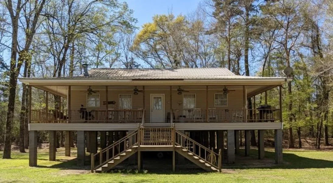 two bath home is located seconds from the Bogue Chitto River and has been raised 7 feet to ensure safety. The three-sided