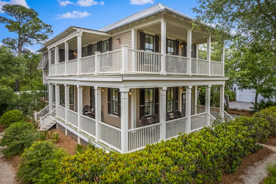 All guest suites include ensuite bathrooms with one on the first level and two on the second. The second-floor master suite features direct access to a porch with enchanting views of Western Lake and the activity of 30A. The master ensuite offers a clawfoot bathtub, dual sinks, extra cabinetry, and a walk-in shower. The detached single car garage includes a 1BR/1BA carriage home with kitchenette. Over 1,200 square feet of porches provide additional space to relax and allow for added appreciation of this home's incredible location only away steps from everywhere you want to go! Sold furnished, this immaculate property is move-in or rental ready.