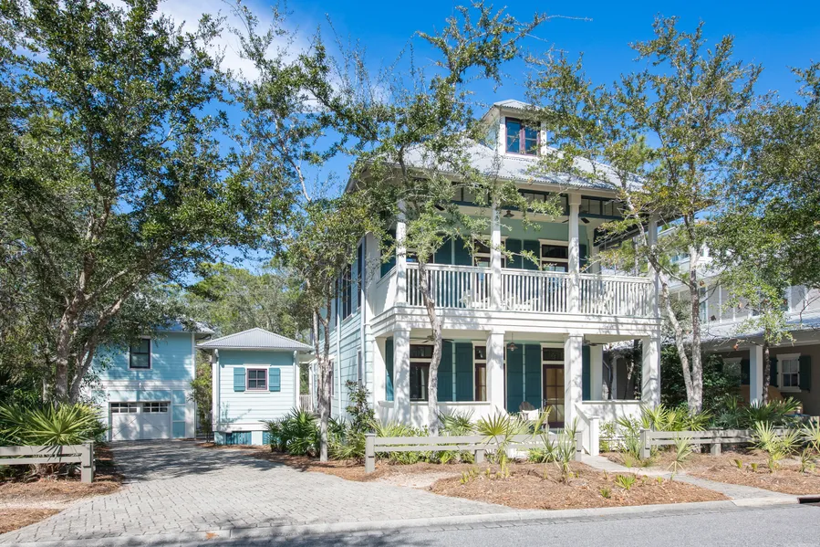 Every detail has been incorporated into this gracious five bedroom, six bathroom WaterColor residence to create the ultimate coastal retreat. Just two blocks from Camp WaterColor yet nestled alongside a community preserve and trails, be in the middle of the action or enjoy a peaceful nature stroll in mere moments. A four bedroom, five bathroom main home, one bedroom, one bathroom carriage home over the two-car detached garage, and a separate bike barn provide ample room for everyone and their accoutrements while the large homesite allows for additional upgrades including space for a private pool. Rich toned hardwood floors contrast with crisp white shiplap walls in the primary living spaces. The open kitchen offers a large center island, granite countertops, professional grade stainless steel appliances, dual sinks, and two-toned wood cabinetry.