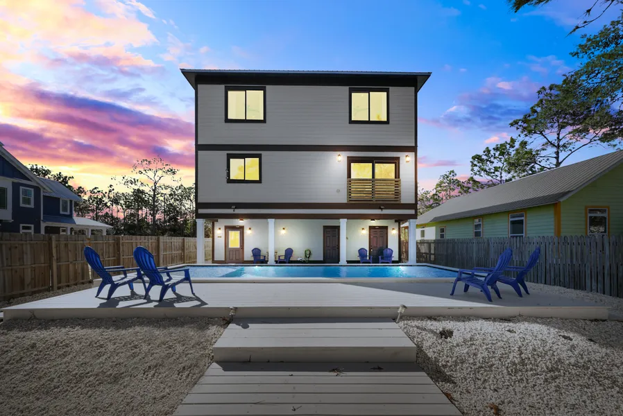 This contemporary beach house at Gulf Shore Manor boasts light bright interiors and coastal chic decor. The expansive accommodation is spread over three floors and includes five beds and 4.5 baths. Completed in 2020, it was updated in 2023 with all-new furnishings and presents like new. The light hardwood flooring is both practical and beautiful, extending throughout the entire home. The large open kitchen with stunning blue cabinetry is designed to cater to groups. It comes fully equipped with an extra large Samsung refrigerator, farmhouse sink and six-burner stove. There’s seating for four around the quartz-topped island and floating shelves lit by LED spotlights. Families, teenagers and renters will love the game area with a selection of tables offering competitive fun just off the kitchen. The attractive dining room with its eye-catching gold chandelier can seat 14 for dinner. Alternatively, throw barbecue meats on the new grill and dine informally on the shady porch. All five bedrooms are on the third floor including two master suites and a bunk room, all with ensuite bathrooms. Thoughtful extras include a full bath downstairs for rinsing off after spending time at the beach or pool. Two laundry closets take care of wet towels on the first and third floors. This high-tech home also has a tankless water heater, security camera system and Nest air-conditioning controller to maximize efficiency. This home is designed for relaxing in the rear yard enjoying the private heated saltwater pool, gazebo and newly painted deck. To the front of the house, there’s an oversized two-car garage and parking for four more vehicles. San Juan public beach access is just a few blocks away for morning walks, swimming, shelling and sunbathing on beautiful Seagrove Beach. Ideal as an investment property with no HOA fees, rental projections show a conservative estimate of $137,000 income for 2023. Available turn-key and fully equipped, it’s already booked for most of the year ahead.