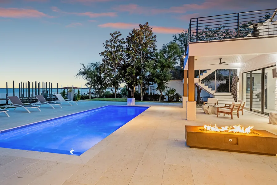 Boaters and entertainers will want to check out this stunning new bayfront home with its own private pool and carriage house. It goes beyond the norm with a deepwater dock, one of the last in Driftwood. The 60-ft. dock can easily accommodate a larger boat and offers direct gulf access via Destin Harbor. This contemporary home has a refreshingly modern facade with clean minimalist lines throughout, making good use of frameless custom glass windows and doors. The design boasts generous indoor and outdoor areas for entertaining, including 2,300 square feet of shell stone on the rear patio. The 30x12 pool provides a focal point for gatherings and has a rear balcony for elevated views across the sheltered waters of Choctawhatchee Bay. The open floor plan flows from the attached three-car garage through a series of living and dining areas to the covered porch and stunning waterfront. This hous...
