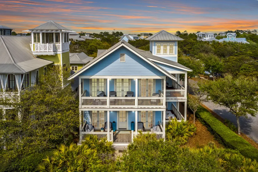 Enviably situated at the intersection of 30A and Western Lake Drive, this desirable WaterColor residence includes a two-car garage with carriage house accommodations and an idyllic private pool with a shady cabana. This elegant home has been beautifully updated including all bathrooms. Beneath the coffered ceilings, you’ll find warm-toned hardwood floors, designer furnishings and coastal-inspired decor. The bright and airy living and dining areas provide space for seamless entertaining and relaxing after a day at the nearby white sandy beach. The chef-inspired kitchen wows with Cambrian quartz countertops, commercial-grade Viking appliances, Shaker-style cabinetry and a generous breakfast bar to seat five. Hosts will appreciate the separate wet bar with beverage refrigerator and ice maker. Four bedrooms in the main house include a guest suite and a half bath on the first floor. Climb the stairs to the second floor to find a spacious guest suite with its own private balcony. There’s also a bunk room for youngsters and a quiet sitting room/TV den with direct access to the side porch. The serene master bedroom exceeds expectations with three closets, a private balcony and a spa-inspired ensuite. It boasts dual vanities, a deep tub and a large walk-in shower. There’s also a laundry room and wet bar/coffee station on the second level. The third-floor tower room provides 360-degree views of the community and the shimmering Gulf of Mexico. A second-floor walk-over connects the main house with the carriage house. It pampers guests with a beautifully appointed bedroom, bathroom, living space, fully equipped kitchen with range/oven, and a Juliet balcony. The incredible outdoor living spaces feature six covered porches, a private swimming pool and a summer kitchen with sink and grill. A pretty trellis shades the lounge area complete with TV and there’s a cabana bathroom and outdoor shower. Located on 499 acres of prime gulf-front, the WaterColor community offers all the charm of small-town life. The well-stocked boathouse offers kayaking, canoeing and paddleboarding on Western Lake. Exceptional amenities include six community swimming pools, peaceful nature trails, fitness center, tennis facility, green parks and a lazy river and waterslide at Camp WaterColor. This exceptional luxury home is also conveniently close to WaterColor Beach Club for enjoying the zero-entry pool, sunset terrace and upscale dining.
