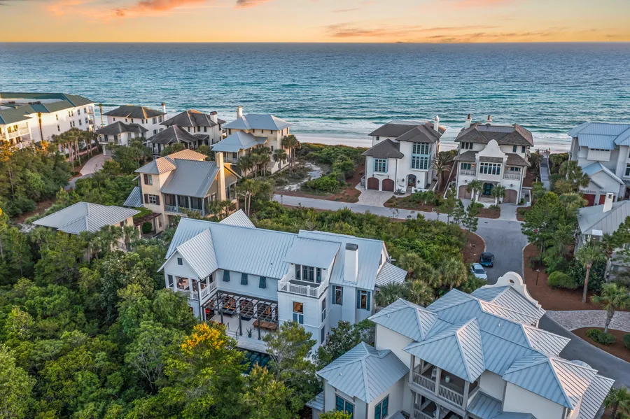 Sitting on more than a quarter-acre with lush greenery, this Tom Christ-designed beach house is just three back from the unspoiled white sandy beach. This luxurious home has recently been remodeled, adding an elevator, a workout room off the master bed and a host of updates totaling around $1 million. This three-story beach home now has a new roof, peacock pavers, a new exterior kitchen and gas fireplace, HVAC in the garage and a complete overhaul in the kitchen. Four of the five bathrooms were remodeled, adding a steam shower in the master. The first floor includes a second sitting room, two ensuite bedrooms and a brand-new second kitchen for independent guests. The grand entrance is reached by a series of steps leading up to one side of the garage. Step inside and you’ll immediately appreciate the spacious layout. It delivers treetop views from the sitting area and den, and seamless access through French doors onto the covered balcony. Where better to enjoy sunset drinks with fresh gulf breezes and the occasional sound of the waves? Heart pine floors and lofty beamed ceilings give a nod to the unspoiled natural environment. The newly upgraded kitchen has eye-catching modern cabinet finishes, a double oven and warming drawer, two dishwashers and a full range of appliances including a chip ice maker. It’s deceptively well-equipped for entertaining on a grand scale. The quartz-topped island with neat bar stools is a natural hub for serving cocktails and snacks. There’s ample space for hosting family and friends with five ensuite bedrooms. The second-floor master suite has a dramatic cathedral ceiling, providing an extra sense of light and space. The adjoining ante-room is a new fitness room with triple-aspect windows providing calming views while you work out. The opulent master bath has an oversized shower, his-and-hers marble vanities and a generous walk-in closet. A third-floor bedroom balcony boasts breathing views of the bordering 25 acres of conservation land. Sliding barn doors hide more storage and a washer/dryer beneath the apex roof. Additional dry attic storage and a whole-home generator are added conveniences. The rear of the property has an attractive private pool and spa for morning dips and the chance to relax beneath the shady pergola. There’s a community pool nearby at the newly-renovated Retreat Beach Club with superb gulf-front views and access to the soft white sand, along with 3,000 feet or private beach. Sports enthusiasts can enjoy boating, kayaking and paddleboarding on nearby Draper Lake or hiking and bicycling in nearby Point Washington State Forest. Scenic Highway 30A is lined with local restaurants for alfresco lunch with friends or enjoying a cool treat at Blue Mountain Creamery.