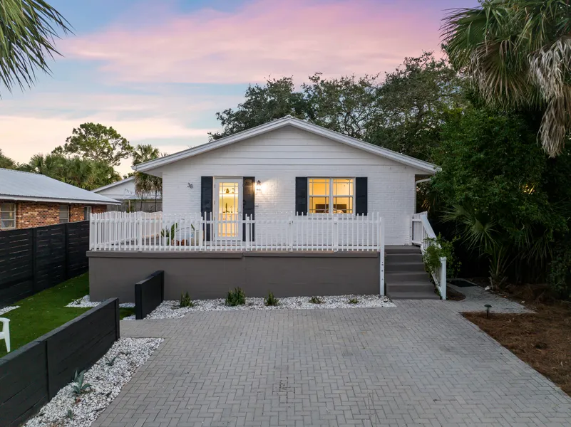 Check out this adorable beach cottage, situated directly off Scenic Highway 30A in pretty Blue Mountain Beach. Fronted by a generous brick paved parking pad, this elevated single-story cottage has been tastefully remodeled and updated. It now boasts three bedrooms and two full baths, a rare bonus. It also has a newer roof and a replacement HVAC system. Wood-look flooring graces the entire cottage, along with narrow shiplap on the ceilings. After a busy day, return home and relax in the cozy sitting room, which showcases a feature wood ceiling and a neat chair rail. The remodeled open kitchen is bright and fresh with floating shelves and uplighting,. It has ample storage in floor-to-ceiling cabinetry and a gleaming glass tile backsplash behind the twin sinks and ceramic stovetop. This vacation getaway has a private fenced yard with a deck for dining and cookouts. Elsewhere, areas of grass...