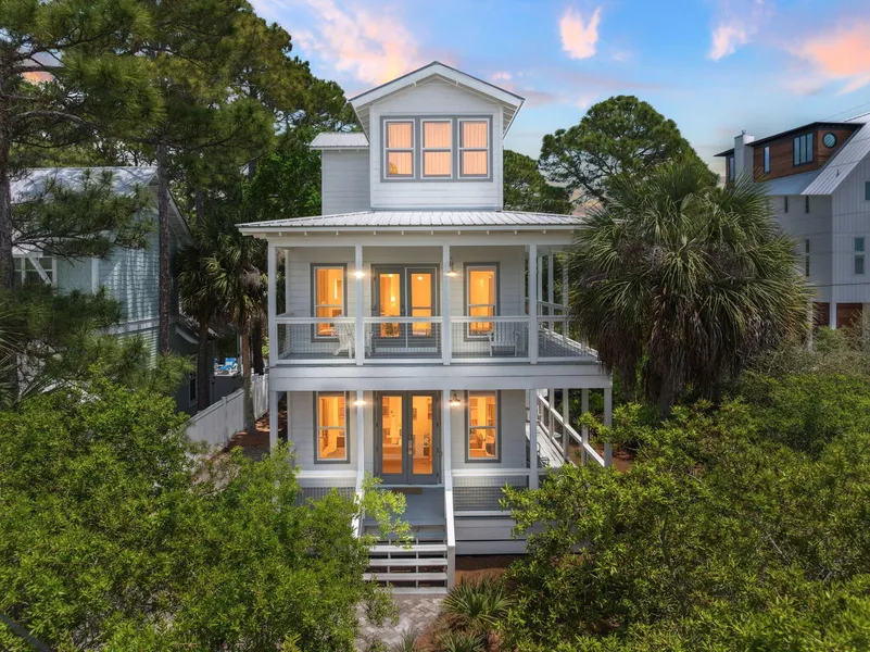 Tucked away on a quiet, partially wooded lot in Seagrove, this renovated home offers the best of beach living - privacy, space, and unbeatable access to 30A's Walton Dunes beach access, all with no HOA restrictions. This beautifully designed 4-bedroom, 3 full bath, 2 half bath home spans 2,318 square feet and features thoughtful updates and ample room for family and guests. The layout includes not one, but two master suites - one on the main level for added convenience, and another on the second level featuring a luxurious ensuite with double vanity, freestanding tub, separate shower, and direct access to one of the home's three spacious porches. Soaring ceilings, hall bunks, and two wraparound porches add to the home's charm and versatility, while architectural details throughout create a warm, coastal character. Out back, your private pool and large patio is the perfect spot to cool off or entertain after a sunny day on the sand. On the third story, a unique tower suite serves as the fourth bedroom and includes its own sitting area and a private balcony an ideal space for a peaceful retreat, reading nook, or creative workspace. Surrounded by native trees and tucked just minutes from 30A's shops, dining, and coastal paths, this home is an ideal primary residence, second home, or vacation rental opportunity. Enjoy the beach lifestyle with room to breathe and no HOA to hold you back.