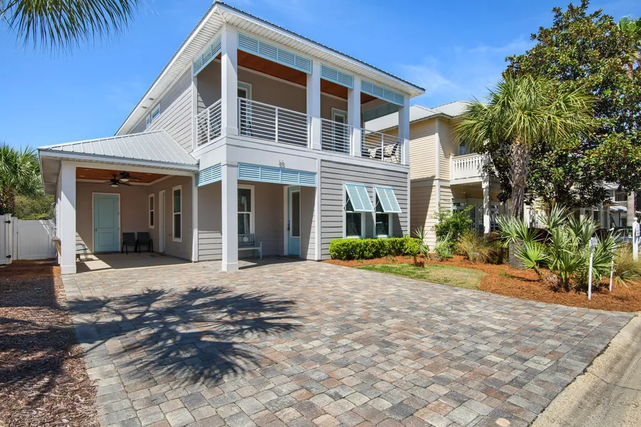 Coastal Luxury Just Steps from the Beach! Fall in love with this furnished turnkey 4BR/3.5BA custom beach retreat in the coveted gated community of Emerald Waters Village! Built in 2019 and thoughtfully designed for comfort and style, with 2 master suites-one on each floor, 2 spacious living areas, soaring 10' ceilings, crown molding & a well appointed kitchen with stainless steel appliances-including a beverage center & under-counter ice maker. You'll love the dual laundry rooms, a tankless water heater, covered front porch & balcony and a fenced yard. The carport includes a large storage area & a private owner closet. With room to sleep 12, this home is ideal for multigenerational living or a vacation rental. Community has 2 sparkling pools & a private deeded beach access.