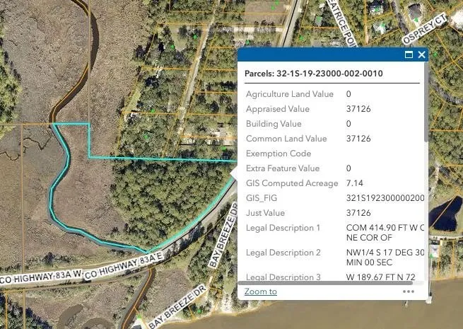 Nestled amidst the tranquil beauty of Freeport, Florida, this expansive 6.07-acre +/- property situated on Bear Creek offers an idyllic setting for your dream home with stunning views of Choctawhatchee Bay. Just off County Road 83A, the property provides a serene escape from the hustle and bustle, yet remains conveniently close to local amenities and the breathtaking beaches of the Emerald Coast. Imagine building your custom home on this lush, green canvas. Enjoy the privacy and tranquility of your own personal sanctuary, while still being within easy reach of shopping, dining, and recreational activities. The property's accessibility and availability of nearby utilities make development a breeze. This property offers the perfect blend of rural charm and modern convenience. Don't miss your chance to own a piece of Freeport's thriving community. This parcel is a portion of Parcel #321S19230000020010, and is located across County Hwy 83A E.