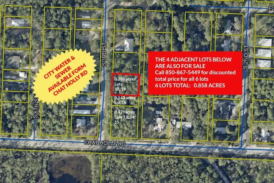OWN LOTS ABOUT TO APPRECIATE IN NEIGHBORHOOD EXPECTED TO EXPLODE AND BECOME HUGELY POPULAR, read on to find out why. Price is for 2 lots only (see photo). 4 more adjacent lots are available (call 850-867-5449 for info).Right below the lots will be built a 10,000 seat amphitheater, walking trails and other recreational facilities (cleared approval). Facilities will occupy 220 acres of land bordered by the South side of Chat Holley Rd (see photo). Lots are centrally located between 30A and Destin (see photo).Less than 3 miles from gorgeous 30A beach and 1 mile from boat launch. Lots are only 8 min. from Seacoast Collegiate High School currently under construction. Lots face S 3rd St. but if all 6 are bought, water/sewer is available via Chat Holly Rd.