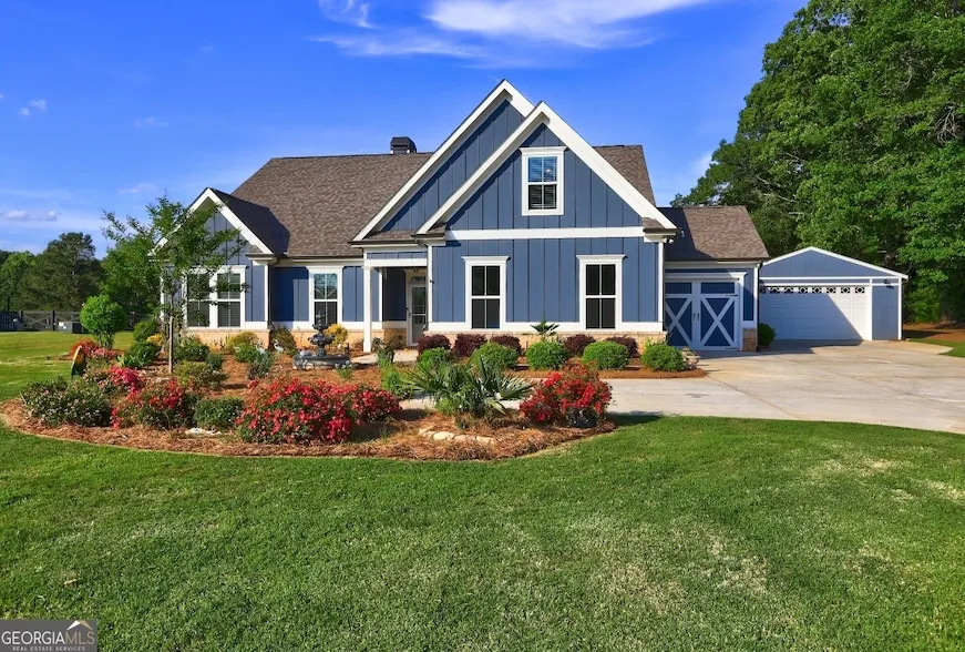 Discover the charm of this custom-built farmhouse, meticulously maintained, nestled on over 2 acres of country landscape. Boasting 4 bedrooms and 3 full baths, this home offers ample space for families and guests. The open-concept living room and kitchen feature stunning vaulted ceilings, a cozy fireplace, and built-in bookcases, perfect for entertaining. The split floor plan ensures privacy, with an oversized owner's suite complete with a luxurious bath featuring a double vanity, dual-headed shower, soaking tub, and generous walk-in closets. Two additional bedrooms and a full bath are conveniently located on the main level. Upstairs, a spacious bonus bedroom with a full bath awaits. Car enthusiasts will appreciate the attached 3-car garage and an additional 25x25 2-car detached garage. The professionally landscaped yard enhances the property's natural beauty, making it a tranquil retrea...