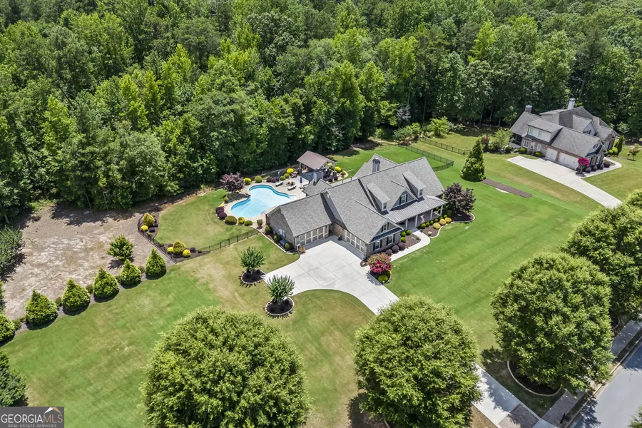 Welcome to one of Walton Counties finest Gated Neighborhoods! This stunning home boasts a spacious master suite on the main level, complete with oversized walk-in closet and a luxurious ensuite bath featuring separate vanities, a soaking tub, and a large tiled shower. A coffered dining room with hardwood floors sets the stage for elegant gatherings. The gourmet kitchen is a chefs dream, offering granite countertops, a large island, stainless steel appliances, a walk-in pantry, all seamlessly flowing into the inviting fireside keeping room and separate family room with built-ins and hardwood floors. Additional conveniences on the main level include a spacious laundry room, half bath for guests, two oversized secondary bedrooms each feature walk-in closets. Upstairs you'll find a massive 4th bedroom with it's own full bath and walk in closet. Outside, enjoy the tranquility of 2 acres of manicured landscaping from the covered patio, inground pool, pool side pergola for shaded seating, firepit and outdoor dining space. Home includes a 2 car attached garage as well as separate detached garage. Located in the Youth school district this home offers exclusivity, elegance, and modern convenience. Close to everything!