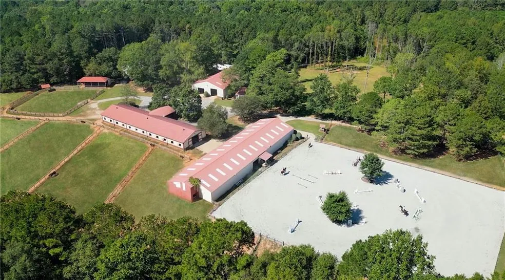 Welcome to Wisteria Farm-an exceptional 30-acre equestrian estate with powerful commercial potential and a layout ideal for a wide array of business ventures. This turnkey property is currently operating as a premier boarding and training facility, but its infrastructure and natural beauty make it a canvas for much more. Equipped with three barns offering 29 stalls, hot/cold wash racks, tack rooms, a lounge with restroom and TV, laundry facilities, and multiple fenced paddocks, this property is built for serious equestrian use. A professional 180' x 70' indoor arena and expansive 200' x 300' outdoor arena-complete with M10 footing, lights, and elevated viewing deck-support year-round training, events, or therapeutic riding programs. Additional features include an 80' round pen, bridle trails, and a derby hill. Events are currently held with ample space and parking for 200+ guests. Complementing the working farm is a beautifully renovated 2-bedroom cottage perfect for housing staff. Strategically located just an hour from Atlanta, the possibilities for this property are vast: Health and wellness retreat or rehabilitation center, Dog training and luxury boarding facility, Corporate, wedding, or event venue, Church or ministry retreat, Greenhouse or indoor farming venture, Storage or showroom for car collectors and enthusiasts. Wisteria Farm is more than land and buildings-it's a rare opportunity to own a versatile, income-generating property that can flex to meet your vision. Whether you seek a business platform, a destination retreat, or a high-end equestrian investment, this property is ready to deliver. Additional estate home available.