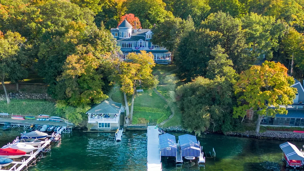 The Echoes is a spectacular Queen Anne Revival Geneva Lakefront home that was built in 1896. The home was designed by Henry Lord Gay, who also designed Stone Manor, Moorings, Jerseyhurst, Folly, Maple Lawn, Gaylynne, to name a few. Echoes is one of the most recognizable properties on the lake with a dominate round tower on the east side and a porte-cochere on the west. The three storied house has over 10,000 square feet of living space with six bedrooms, six full and two half baths, 12+ foot ceilings, original woodwork, built-ins and stunning lake views. It is situated on 1.75 acres with a gentle slope to the lakefront with 140 feet of Geneva Lake frontage. There is a 160-foot-long pier with two boat slips and a smaller pier with jet ski ramps. The lot is irregular in shape and is 233 feet in width and 400 feet in depth, providing a substantial yard with a tennis court and a four-car heated garage topped with a rooftop deck overlooking the lake. There is also a large, elegant rooftop pavilion perched on the boathouse that sits on the shore of the lake. Fontana sewer and water. Home sold as-is.