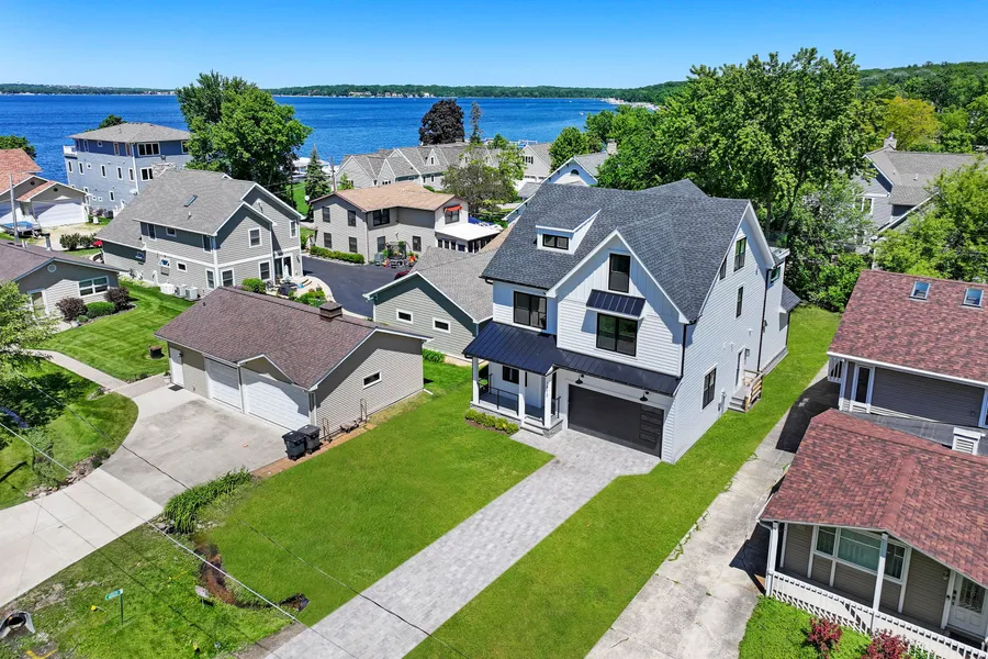 Gorgeous new construction home located three houses off Geneva Lake with lake rights in the Lake Geneva Beach Association. This three-story home has four bedrooms, three and a half baths, 9-foot ceilings, and an open floor plan. Stunning gourmet kitchen with custom cabinetry and built-in appliances opening to the living room, dining room and large deck overlooking the picturesque yard. Features include a primary bedroom suite with beamed ceilings and luxury bathroom, first-floor office, second-floor laundry, and a two-car garage. Enjoy gorgeous lake views from the third-floor family room with wet bar and oversized deck, giving you the best seats in town for the Lake Geneva fireworks! Elevator upgrade available. Lake access includes private association beach, playground, swim pier, diving board, water slide, and more.
