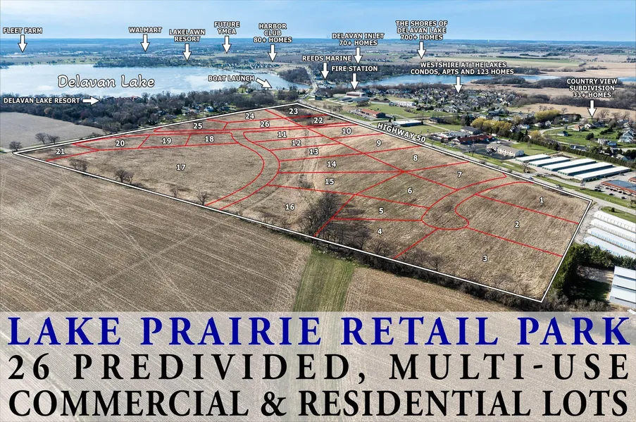 Lake Prairie Retail Park presents an exceptional opportunity to serve the rapidly growing demand of the entire Lake Geneva area. Spanning 66 acres this pre-divided development includes 26 mixed-use commercial and residential parcels. Zoned B-2, R-4, and R-5, supporting a blend of retail, service and residential uses. Strategically positioned on a prominent corner Lake Prairie offers 2,600+/- feet of frontage along Highway 50, one of Walworth County's major thoroughfares, and an additional 2,000+/- feet of frontage along Hwy F, the main road between Delavan to Fontana and Williams Bay. Lake Prairie Retail Park stands ready to become one of the region's premier destinations.