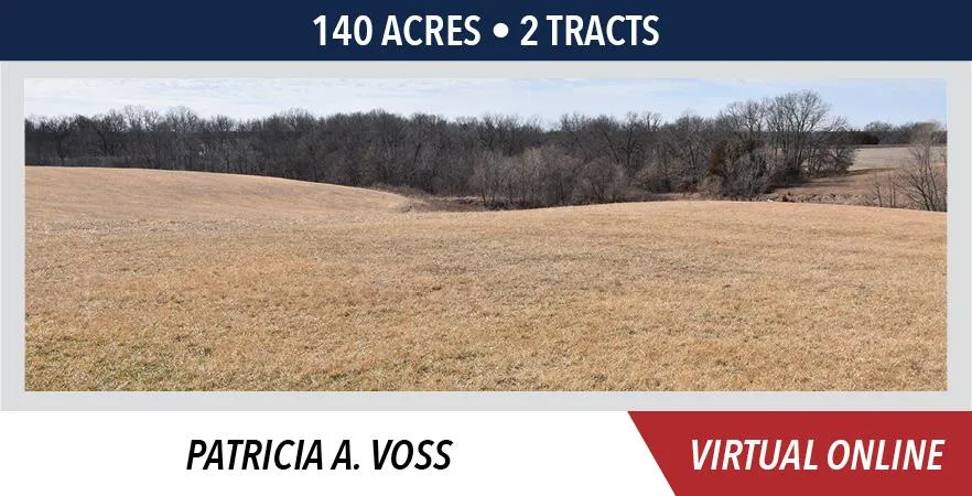 The Voss farm will be sold in two (2) individual tracts based on a survey that is currently in progress. Tract 1 will be sold first for a lump sum, total dollar amount, followed by Tract 2 that will be sold on a price per acre basis, based on the surveyed acres used to constitute the final settlement price. Bidding is NOT contingent upon financing. The farm will NOT be combined at the conclusion of the auction.