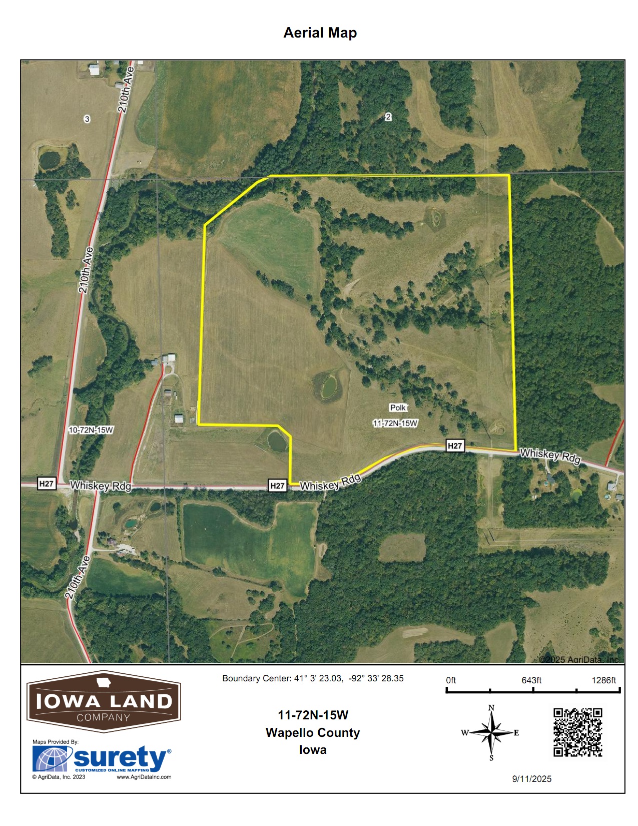 Welcome to a remarkable 107+/- acre property located in the heart of Wapello County Iowa This 107+/- acre Southern Iowa farm offers a trifecta of exceptional farm versatility and future long-term value. Whether expanding your current livestock operations, developing a diversity of farm use or investing in a sound investment in Iowa agriculture. The farm features approximately 32+/- acres in hay production with a CSR2 of 59.6. There are approximately 65+/- acres of pasture ground with new seeding from an NRCS program. There is strong fencing around the perimeter of the farm with several separate lots to rotate pastures. There are 3 ponds with 1 having a cobett water system and the other has a geo star water system. Excellent access and layout for both crop, hay and livestock operations. There is a beautiful building site on the hill that would be an awesome place and enjoy the sunset over your farm. The hay ground acres are leased on a 50/50 split until March 1, 2027.