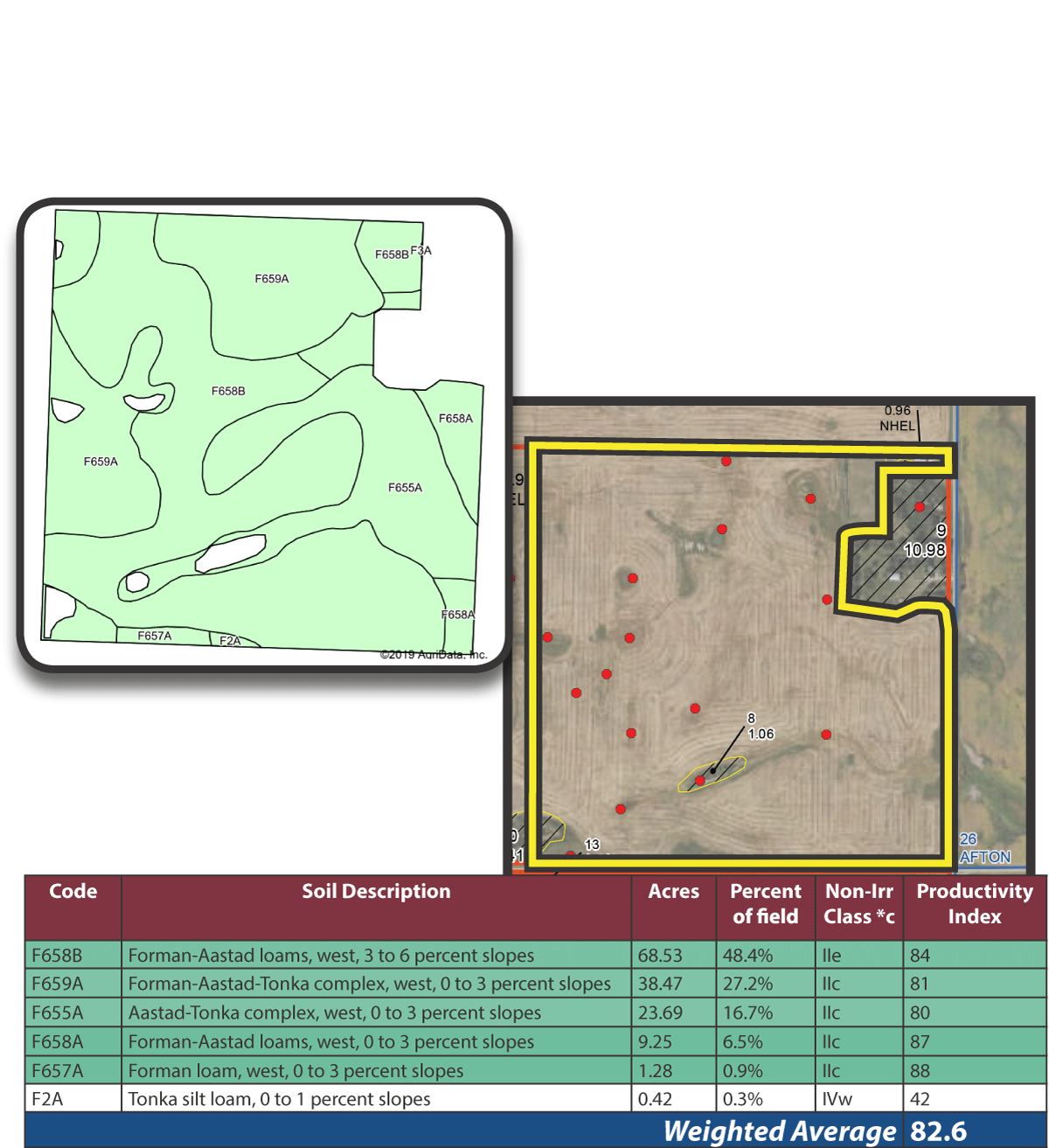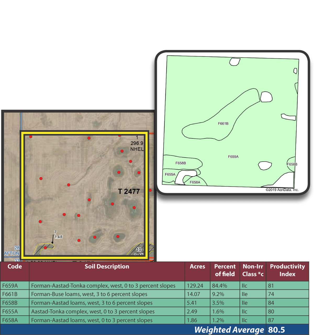 Parcel Note: Parcel 1 features 160 acres of highly productive cropland. Over 80% of the field has a Soil Productivity Index (SPI) of 81!