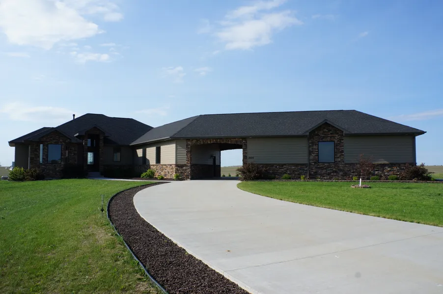 Amazing, custom built home situated on 3.66 acres just minutes from the new Trinity Complex. No detail overlooked. As you drive up your concrete drive, you will see the only home in Minot with a gorgeous Porte Co-Chere covered passageway connecting the detached 1214 sq ft garage from the main house. As you look at the house, your view is not distracted by daunting garage doors which are on the back side. Nice landscaping adorns the walk up to the front door. The exterior has smartboard siding and beautiful stone. As you enter the home, you are greeted with an open floor plan and nice vaulted ceilings. The view is amazing with lots of natural light shining in. In front of you is the living room with a floor to ceiling gorgeous fireplace using Virginia Ledgestone. To the left you will find an office and the master suite with nicely treyed ceiling. The master bath is incredible with two granite topped vanities, a jet tub and an incredible shower with travertine tile on the floor and walls. Access your master closet from the bathroom. Heading into the gourmet kitchen you will be pleased to see the custom cabinets by Minot Sash and Door with a 5 X 8 island. All counters are granite. Don't miss the built in Jenn Aire Coffee Maker. Off the kitchen is a super functional pantry, 1/2 bath and laundry/mudroom with utility sink. The dining area will be perfect for family gatherings. To the right, you will find two very nice sized bedrooms with a Jack and Jill bathroom between.