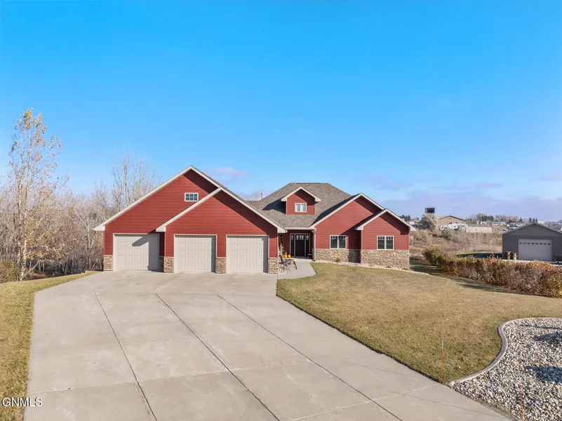 Discover the perfect harmony of luxury and warmth in this stunning property only minutes from Minot, ND. This property features a peaceful and partly wooded lot and a 7'-9' deep pond, perfect for enjoying nature, wildlife, and scenic views. You just found a beautiful custom-built home on 5 acres that offers an exceptional blend of craftsmanship, comfort, and thoughtful design. With 5 bedrooms, 4 bathrooms, and over 5,300 sq. ft. of living space, this home is a true masterpiece. Step inside to be greeted by vaulted ceilings, rich knotty alder trim and doors, and expansive windows offering an abundance of natural light. The heart of this beautiful home is a spacious living room with tall ceilings, creating an open and inviting space perfect for both relaxation and entertaining. The spacious kitchen is a chef's dream, featuring granite countertops, an oversized island, two pantry areas, and ample cherry cabinet space, seamlessly flowing into the dining room. The dining area offers room for a larger dining table for your gatherings and entertaining - even better, it is right off the large deck that overlooks the naturous backyard. Opposite the dining room off of the kitchen, you'll find a conveniently located half bathroom, mud and laundry room with beautiful cabinetry, and counter space that anyone would appreciate. The large primary suite opens to the deck and boasts an ensuite with a custom tiled shower, double sinks, and an organized walk-in closet. Two additional nice-sized bedrooms and a full bathroom are also on the main level. Upstairs, a 22'x35' bonus loft above the garage is pre-wired and ready to become a media room, additional living space, or even a sixth bedroom - that is 770 SF! The expansive walk-out lower level is designed for both relaxation and entertainment, featuring etched and heated concrete floors, a gas fireplace, two large living spaces, and a wet bar. Two more spacious bedrooms and a full bathroom make this lower level perfect for guests or family. Also in the lower level, who wouldn't love the generously sized storage and utility room with even more cabinetry and counterspace, and large shelving for extra storage Step outside from the walk-out basement to the 16'x28' brick patio with a concrete pad and electrical hookups for a hot tub—ideal for enjoying peaceful North Dakota evenings. This home is loaded with premium amenities, including a built-in security system, integrated sound system, heated floors in lower level and garage, and a central vac system. The oversized 3-stall garage (1,218 SF) is a dream, offering heated floors, a workspace, built-in storage, water hookups, and three floor drains. Enjoy the perfect blend of privacy, space, and luxury, all just minutes from Minot. This one-of-a-kind home is ready for its next owners—schedule your showing and you won't be disappointed!