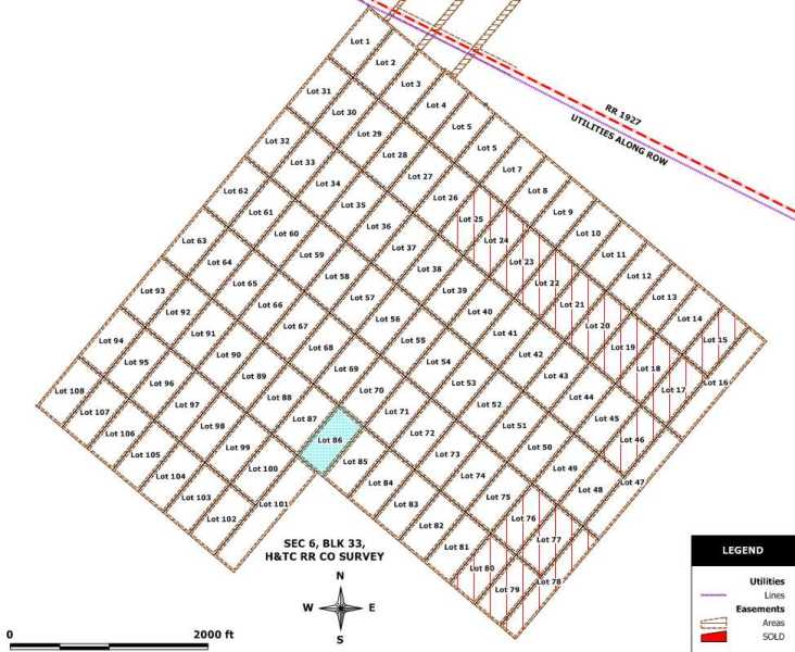 Lot #86 out of Section 6, Block 33, H&TC Railway Co. Survey, Ward County, Texas, ±5.1 Acres. Lying just north of the Pecos River, the property lies in an area of rural beauty. The property is flat to slightly rolling with sandy soils and sparse vegetation, which provides wide open views of the surrounding area. The brush is widely spaced, leaving plenty of room to get around. Easy to get to from IH-20 or IH-10, the property has legal access from Farm-to-Market Rd 1927. Electricity and phone utilities are along the highway, only a few feet from the north corner of the section.