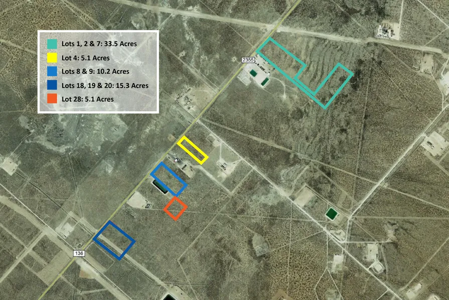 5.1 69.2 acres total available for lay down yards. The lots are broken up into 5 different sections of 15.3 Acres, 10.2 Acres, 5.1 Acres, 5.1 Acres, and 33.5 Acres. Available in part or whole. Owner will lease raw land or add fencing, caliche, and power hook up. Rates and terms negotiable depending upon improvements.