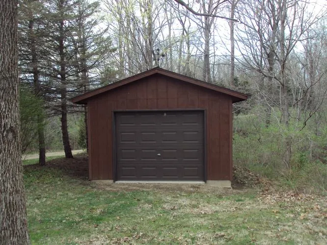 Log style with an additional 906 sq. ft. basement with living room, den, 1 bath, laundry room. enclosed screened porch - open deck, 2-1 car detached garages, 1 built in gargage, v shaped pond with small bridge, on 5 wooded acres. Asphalt drive, 2 stone fireplaces.