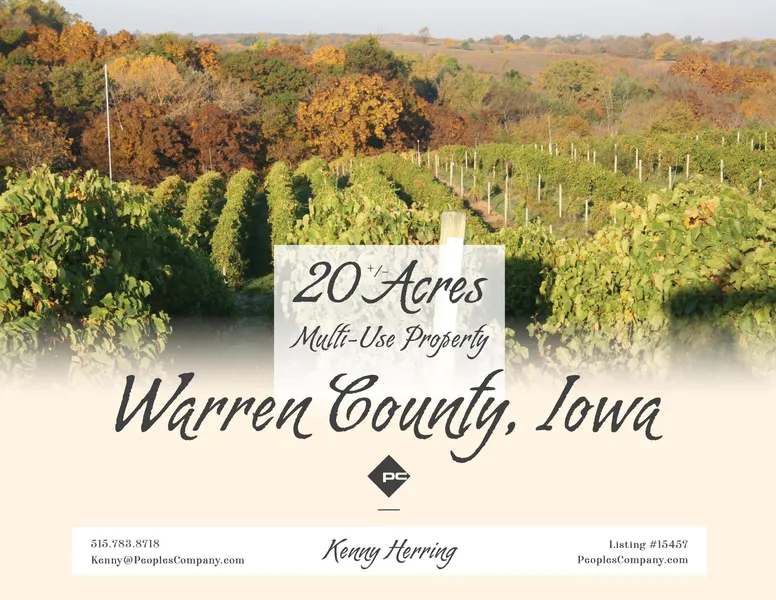 Paint this canvas to suit your desires. This property is only limited by your creativity and imagination. This site has currently been operating as a well established winery, vineyard and event center for 13+ years, but could easily be transformed into multiple money making opportunities including bed&breakfast, hunting outfitter lodge, distillery, brewery, wedding venue, hobby farm, or executive ranch residence. The property has 20 gross acres which includes 4+ acres of mature grape vines. Grape types include Frontenac, St Pepin and Baco Noir. The building was constructed using commercial standards with 10' 5" ceilings, steel bar joist, and structural insulated exterior panels (SIP). High efficient geothermal HVAC system keeps utility cost at a minimum. Event center area has a large open dining area, dance floor, full bar area and much more. The retail side offers a storefront with the space to showcase and sell product. The 4,800 square foot basement is currently used for production and storage of inventory. Exterior features include 2,400 square foot wrap around deck, entertainment area, enclosed band pavilion of approximately 450 square foot built inside a natural amphitheater. Located within 30 minutes from the Des Moines metro area, just a mile off of Interstate 35s St Charles exit.