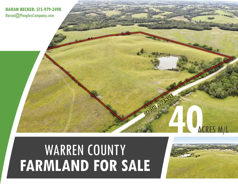 Offering 40 acres m/l located just a few miles south of Lacona, Iowa in Warren County. The land is currently all in hay but can be farmed if so desired. The farm features a beautiful spot for a home overlooking the pond loaded with bass, bluegill and crappie. Rural water runs along the property and electric is located across the road. This would make an excellent building and/or recreational site as well as a perfect starter farm for your cattle operation.