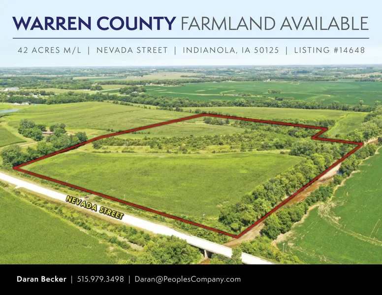 Offering 42 acres of prime Warren County farmland located just east of R63 on the newly paved Nevada Street. This farm has approximately 24.11 acres currently being farmed with a CSR 2 of 78.6. The rest of the farm is in timber. The location and views make this property the perfect place to build your dream home. If you are a hunter, Squaw Creek is the major corridor for whitetails traveling from Middle River to Lake Aquabi State Park and if you like to develop large acreages, there are multiple building site possibilities. There is 35 acres m/l also available to the West.