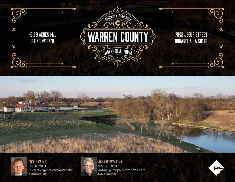 Incredibly scenic and immaculate Central Iowa property - a 48.59 acre m/l dream with a multi-use building offered by Peoples Company. Situated on Jesup Street, just 4.5 miles west of Indianola, Iowa, lies a gem locally known as "La Vida Loca". This property features a long list of attributes that make this a truly one-of-a-kind and rare opportunity to own one of the most put together and beautiful properties in Warren County. The property is currently situated as a venue and retail space with a small vineyard and jaw dropping views of the surrounding landscape, including a 2.7 acre pond, over 25 acres of CRP established native grasses, and mature hardwood timber. Many uses are in the cards for this property, whether you want to utilize the building space as a venue, restaurant, weekend getaway or would like to build your dream home on a picturesque setting, this one is only limited by your effort and imagination.