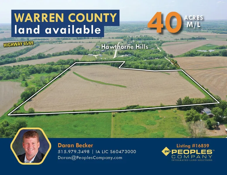 Peoples Company is pleased to offer an excellent opportunity to buy top-quality Warren County farmland with unlimited building site and development potential! This 40.06 acres m/l is located less than 4 miles south of the Des Moines Metro and less than a 1/2 mile off Highway 65/69. It has proven development potential, situated on the east edge of Hawthorne Hills Subdivision but also offers privacy with only one access at the end of Delaware Street. The convenient location and scenic country views have an executive lot potential, but you may want to keep it all to yourself, the choice is yours. The 37.89 tillable acres are over 95% Sharpsburg soils and carry a CSR2 of 73.3. The tillable farmland is rented for the 2023 cropping season. Rental information is provided upon request.