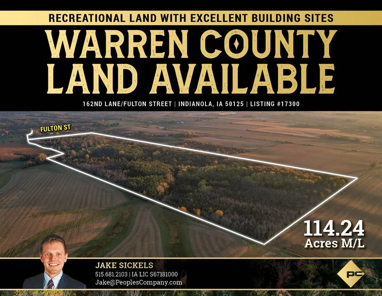 Peoples Company is pleased to present this hard-to-find and secluded recreational farm with excellent building sites near Indianola, Iowa. The farm consists of 114.24 acres m/l and features income producing CRP acres, miles of manicured trails and access points, established food plots for wildlife, a half-acre pond, and much more. The farm is located just northeast of Indianola and is within close proximity to the Des Moines Metro area.