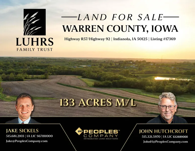 Peoples Company is pleased to represent the Luhrs Family Trust with their sale of 203.65 acres m/l, to be offered in three tracts, just west of Indianola, Iowa on Highway R57. These tracts consist of excellent row crop opportunities, exceptional building sites, and beautiful recreational land. The Luhrs family has been excellent stewards of the land being offered, providing new owners a turn-key asset. All of these tracts are conveniently located within 25 minutes of the West Des Moines Metropolitan Area.