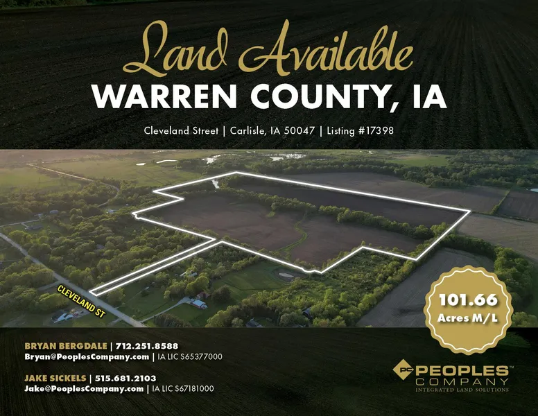 Peoples Company is pleased to represent the sale of a unique and mixed-use land offering located just off of the pavement and 15 minutes from the Des Moines Metro. The property is located immediately south of Carlisle, Iowa on Cleveland Street with easy access to Highway 5 and Highway 65/69. This property consists of 101.66 secluded acres that could be utilized as a future subdivision site with multiple platted split configurations that allow between 3 and 10 lots as well as a high-quality tillable farm located in a strong farming area.