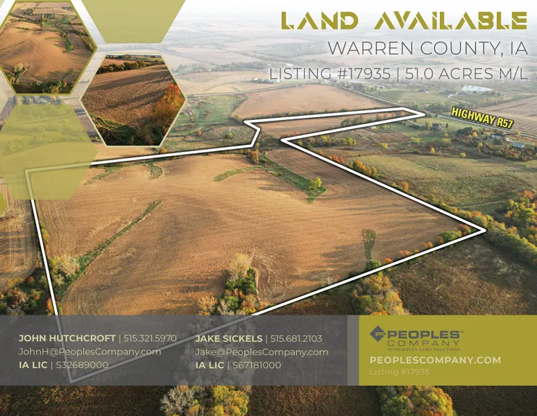 Peoples Company is pleased to represent the Tina Turner Estate and its heirs with their sale of two high-quality Warren County, Iowa land holdings. The tracts are located on Highway R57, just between Indianola, Iowa, and Norwalk, Iowa, with convenient access to and from the Des Moines Metro area. The tracts feature excellent building sites, productive cropland, recreational qualities, and more.