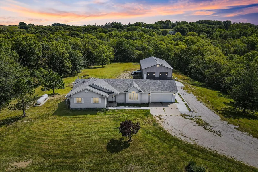 Welcome to your perfect retreat! This sprawling 11+ acre property offers a unique blend of country tranquility and convenient access to city amenities. Whether you're looking for a peaceful getaway, a hunting haven, or a versatile space for your hobbies, this property has it all.?Brand New Outbuilding: A must-see for any hobbyist! This outbuilding is packed with features and perks, heated, sound, solar panels, lifts, drains and as many outlet types as your hobbyist heart desires. Equipped with new solar panels that power both the outbuilding and the walkout ranch home. The walkout ranch features 3 bedrooms on the main floor and an additional bedroom on the lower level. Enjoy two family rooms, vaulted ceilings, a dining room, and ample storage throughout. The lower level is stubbed for a 3rd bathroom, includes a wood-burning stove, and features two storage rooms plus an HVAC room with a new tankless water heater and water filtration system. Freshly poured patio and driveway and new roof make this one move in ready.? Just 1 mile of gravel from the main road, with quick access to Indianola and the Des Moines metro via the interstate. Embrace country living with all the benefits of nearby city amenities.
