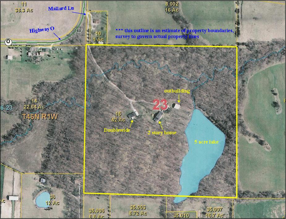 42 acres, mostly wooded with a private four acre lake! A cleared home site is nestled in the middle of the 42 acres overlooking the lake to allow for a gorgeous view, a great estate site! Wooded acreage provides plenty of privacy and ample room for hunting and recreation. A 40 x 40 outbuilding for storage is included! A newer doublewide home with well and septic on property as well, perfect for temporary residence as you build your dream home!!! A picturesque country setting you must see! Located of the Foristell exit of Highway 70 with an easy commute to St. Charles. Property is agent owned.