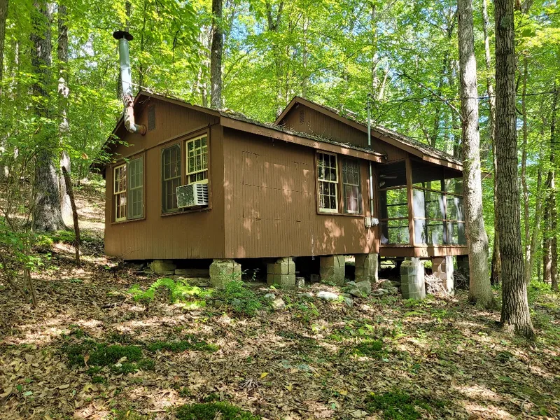 Secluded cabin with wood burning fireplace, electric and stove. Ideal place for your outdoor adventures including hiking, mountain biking, trout fishing, deer and turkey hunting. Borders 5000+ acre Pequest Wildlife Management area. Sold" as is" .Needs septic( currently serviced by failed cesspool) and well(water is from above ground spring)