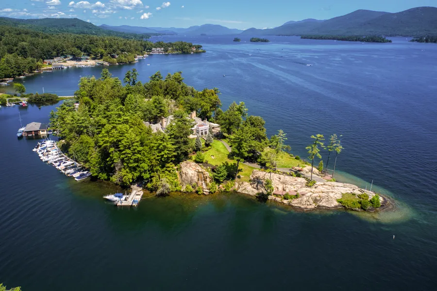 This turn-of-the-century mansion is a showstopper. Sitting on its own peninsula with an astounding 2,700 feet of lakefront on the Queen of the Lakes at the end of a private road, your most striking view of Lake George and the mountains are simply breathtaking. From the massive stacked-stone portico to the wainscoting to the coffer ceilings, immense rooms, elaborate fireplaces, gorgeous crown moldings, redwood gourmet eat-in kitchen with a spectacular view, and natural light flooding into each and every room are incomparable. The unique configuration allows for gracious public gathering spaces, both inside and out, or allows you to disappear into your own private retreat in your own wing! This magnificent home boasts 15 bedrooms, 7.5 bathrooms, almost 12,000 square feet, formal dining room, billiards room, and ballroom turned living room. Amenities include a boathouse with 2 separate showers, 36 dock spaces, diving board, rope swing, waterfall, greenhouse, expansive patios, separate balconies, private sandy beach, a 4 bedroom stone cottage with private gazebo, 2 separate 2 bedroom apartments with full kitchens, one with a private screened-in porch. Truly a once in a lifetime opportunity to own the absolute most amazing house on the Lake!