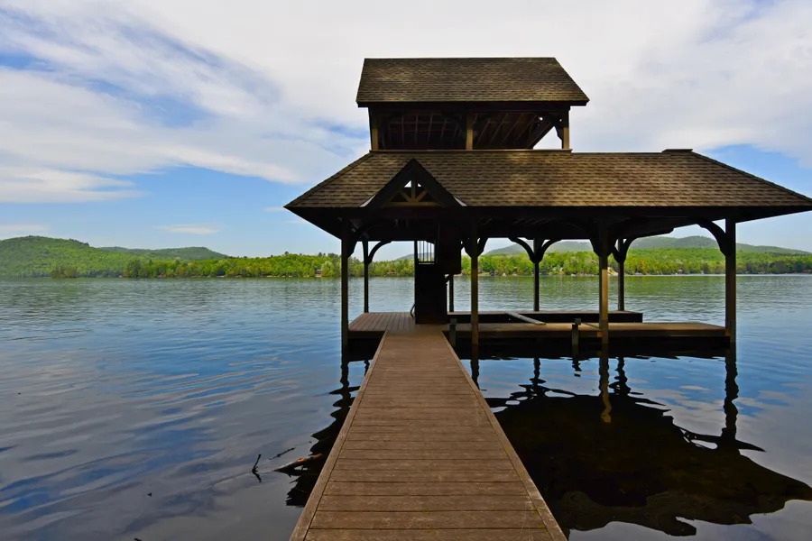 Stunning, like new, contemporary on Brant Lake with 300' of lakefront with double decker dock system, beach, boat launch all on 2.32 acres being sold with adjoining .40-acre lot. This home boasts a floor to ceiling stone wood burning fireplace that has never been used, a first-floor master suite with full bath and walk-in closet, custom designed kitchen with stainless steel appliances, granite counter tops, breakfast area with lake views and walk-out to a screened porch. The formal dining room is lined with windows overlooking the lake and a dining room set that accommodates 14 people. There are 4 bedrooms on the second floor with 2.5 baths, a powder room on the first floor and a full bath in the basement off the family room. The home has 3 furnaces, 400-amp service, automatic generator, a/c, sprinkler system, security system and hot water on demand.