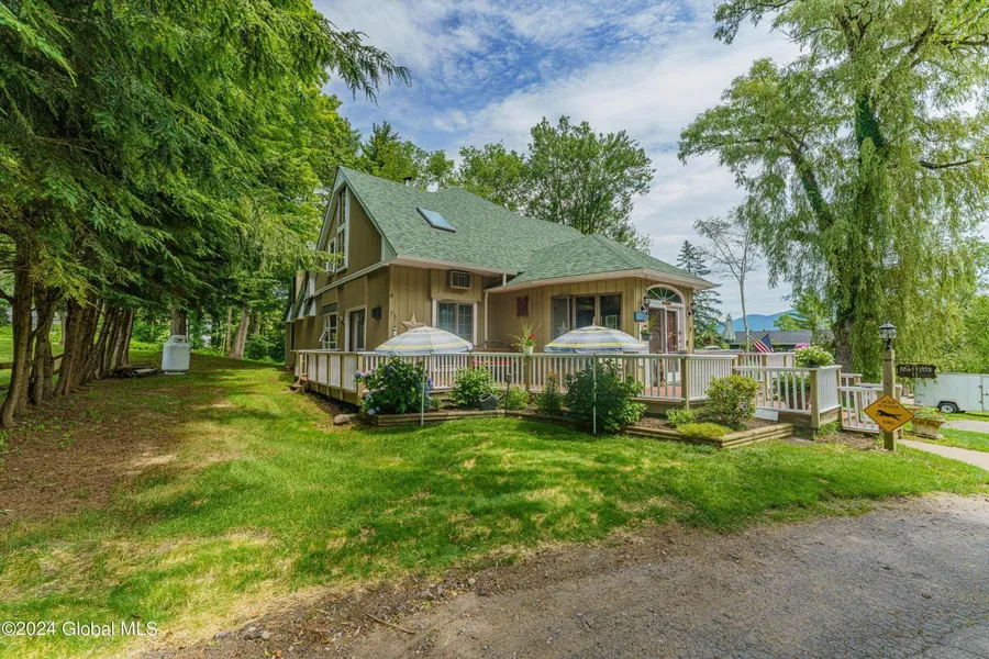 Discover year-round beauty at this charming Diamond Point home, just 800 feet from Lake George, ''The Queen of Lakes.'' Enjoy breathtaking mountain views and Adirondack rustic charm, featuring beamed cathedral ceilings, a spiral staircase, and an oversized kitchen chandelier. Recent updates include a new roof (2020) and exterior paint (2022). The unique layout offers 3 versatile lofts for storage, office, or a guest room, plus a stunning spacious foyer, living room, and family room?both with propane fireplaces. Entertain on the multi-level wraparound porch. The garage is currently being used as a large workshop. Don't need so much space? This home offers potential for two in-law suites with rear deck access.