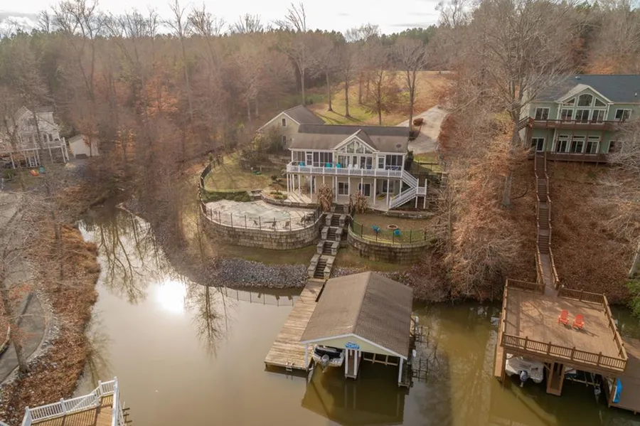 Lake Gaston Waterfront Home! Income Producing Property! Conveniently located near the heart of Lake Gaston on an approx acre parcel. Site built 4BR/4BA, undesignated room, open main level with formal LR with FP, DR, Kitchen. Main levels offers direct access to lakeside deck and screened porches, lots of natural lighting and lake views. Full finished lower level w/ family room, kitchenette area & walkout to the lakeside patio areas. Lakeside pool area and separate lakeside fire pit area. Steps to double boathouse w/ jet ski lifts. Concrete driveway & detached triple garage with an unfinished upper area. Pool encroaches on DOM property and Seller will pay for revocable permit. Some furniture is negotiable. This property falls under the NC Vacation Real Estate Act and has a strong rental history. Call for your appointment to view!