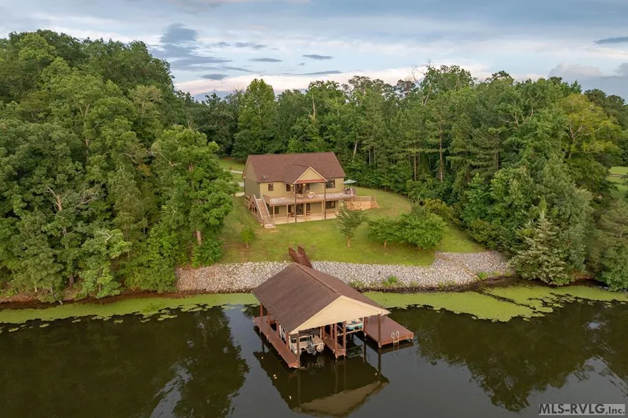 Discover lakeside living in this newly constructed, custom waterfront home and 5.9 ac total! The 3,253 sqft of thoughtfully designed living space harmoniously combing elegance, comfort, & functionality. Step inside the open floor plan that seamlessly integrates lake views with sophisticated design elements. The dining area is graced by a striking pine vaulted ceiling, creating an inviting atmosphere for gatherings. The Kitchen features premium accents including quartz countertops, and top-of-the-line FORNO appliances. Adding a touch of historic charm & captivating focal point, the 135-year-old redeemed black stone fireplace (from Washington DC area). The main level primary suite offer serene lake views. Private primary BA with large walk-in closet & built-ins. Convenient main level wet bar, BA, laundry area. The main level opens to the ample lakeside deck for outdoor entertaining. 4BR/3.5BA, a fully finished walkout basement featuring a custom wood bar, where everyone knows your name, its large space where the layout provides versatility to suit varying needs. 2 add'l outbuildings, fence, & circular gravel driveway ensures both outdoor space & privacy. Embrace the tranquility of the outdoors with the double boat house, jet ski lift, perfectly situated in a low-traffic, peaceful cove ideal for many water activities. The property is enhanced by its add'l 4.9-acre parcel offering year-round versatility for outdoor enthusiasts - whether it be 4-wheeling, small game hunting or use the acreage for a separate guest house. So many possibilities! Just a mere five minutes from Lake Gaston's conveniences & essentials. This property & its acreage presents a unique opportunity to enjoy a serene lakeside life, where luxury meets nature in perfect harmony.