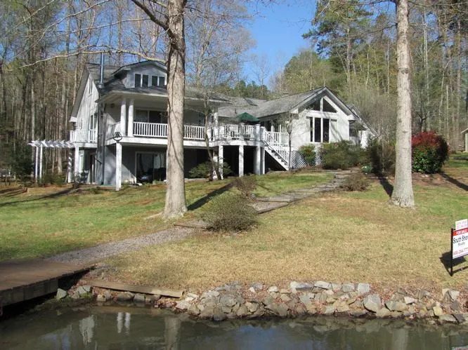 Uncompromising in every detail this spacious home has a sophisticated cottage appeal. Main level includes livingrm, dining rm,kitchen, master BR & BA, large corner rm study, guest BR, hall bath & mud/laundry room.Upstairs is a BR, half BA and unique children's sleeping area. Basement includes a den (w/sleeper sofa) and workshop & doubles as storm shelter. Yodel wood stove. Elegant covered porch & deck add character & appeal lakeside. Double garage w/work area & storage w/stairs. Hardwood floors, granite counter tops, skylights, walls of windows, lots of storage, built-in's, fireplace w/gas logs, single boathouse, sundeck, jet ski lift.