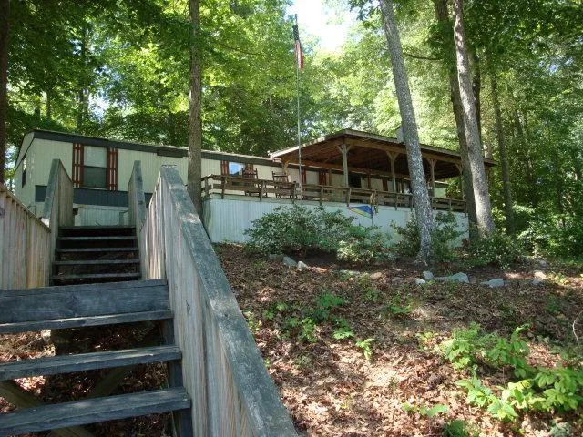 Great lot looking right at the main lake on south west end of lake close to I-85. 1991 mobile home with two large bedrooms and two bathrooms, central great room which opens out to large covered porch and large deck lakeside. The view is lovely and there's a single boathouse and partially bulkheaded waterfront. Furniture and furnishings convey. Have upgrade permit for 3 bedroom home if you want to put a double wide or modular on the lot.