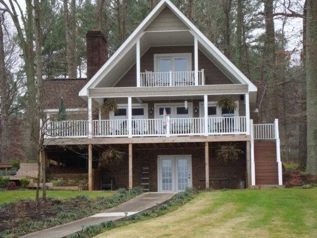 Fantastic lake cottage with awesome main lake view! Everything you want! Beautiful granite countertops in kitchen, oak floors in main living area, three atrium doors lakeside for natural light and main lake view, basement rec room for the kids with tile floor, brick fireplace, french doors to large patio; two bedrooms upstairs with a full bath and a bedroom on the main level; very spacious covered synthetic wood deck which wraps around the house; easy steps and concrete path to water. Lot is very gently sloping and close to the water. Huge, new double boathouse with tiki bar and covered or open sitting areas. Lots of parking and circular driveway. Very low maintenance home! Great location!